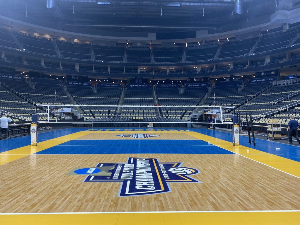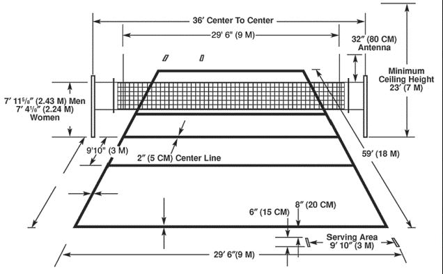 FIVB ke rules ke anusar volleyball court 18 meter (59 feet) lamba aur 9 meter (29.5 feet) chauda hona chahiye. Court ko do bhagon mein baanta jaata hai jisme 9 meter (29.5 feet) ke baad beech mein net lagaya jaata hai. Net ka oopari hissa 2.43 meter (7.97 feet) ki unchai par hota hai (mains) aur 2.24 meter (7.35 feet) ki unchai womens ke liye hoti hai. Attack line jo front aur back court ko baantti hai woh net se 3 meter (10 feet) door hoti hai.